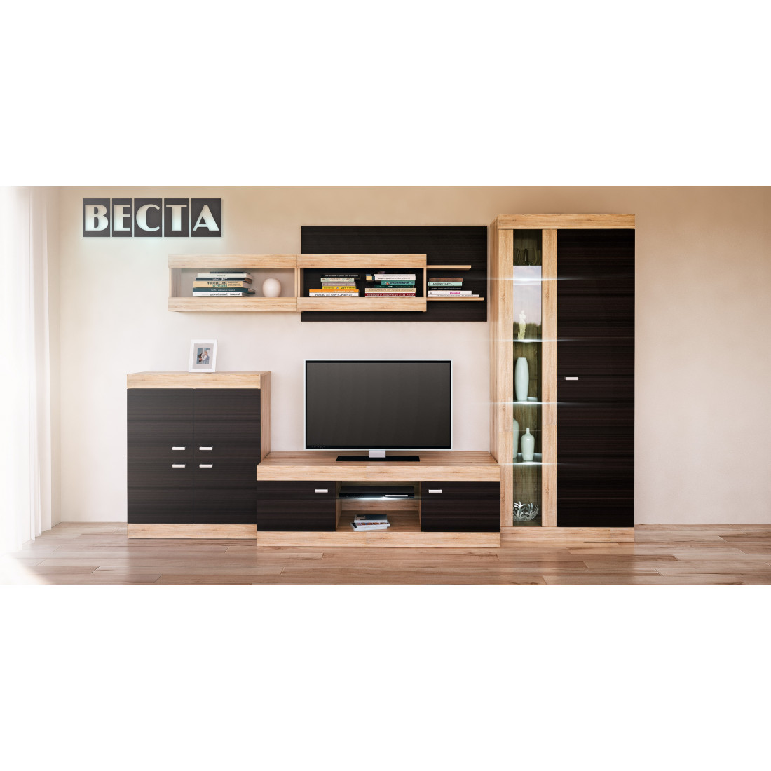 Комбинированный шкаф для гостиной Веста придется по вкусу и цвету практически всем.
